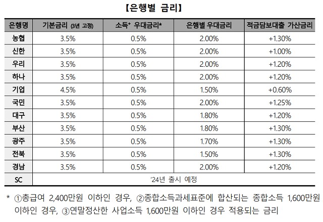IBK기업은행이 4.5%로 가장 높은 기본금리를 제시하고 있으며 나머지 해당 은행들은 3.5%로 기본금리가 동일합니다. 또한 SC 제일은행은 2023년에는 참여하지 않고 2024년에 참여할 예정이니 참고하시길 바라겠습니다.