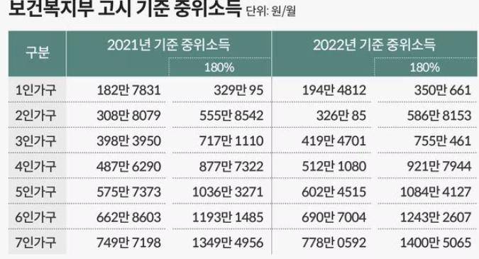 ⭕ 가구소득 : 중위소득 대비 180% 이하 기준에 해당되는 자